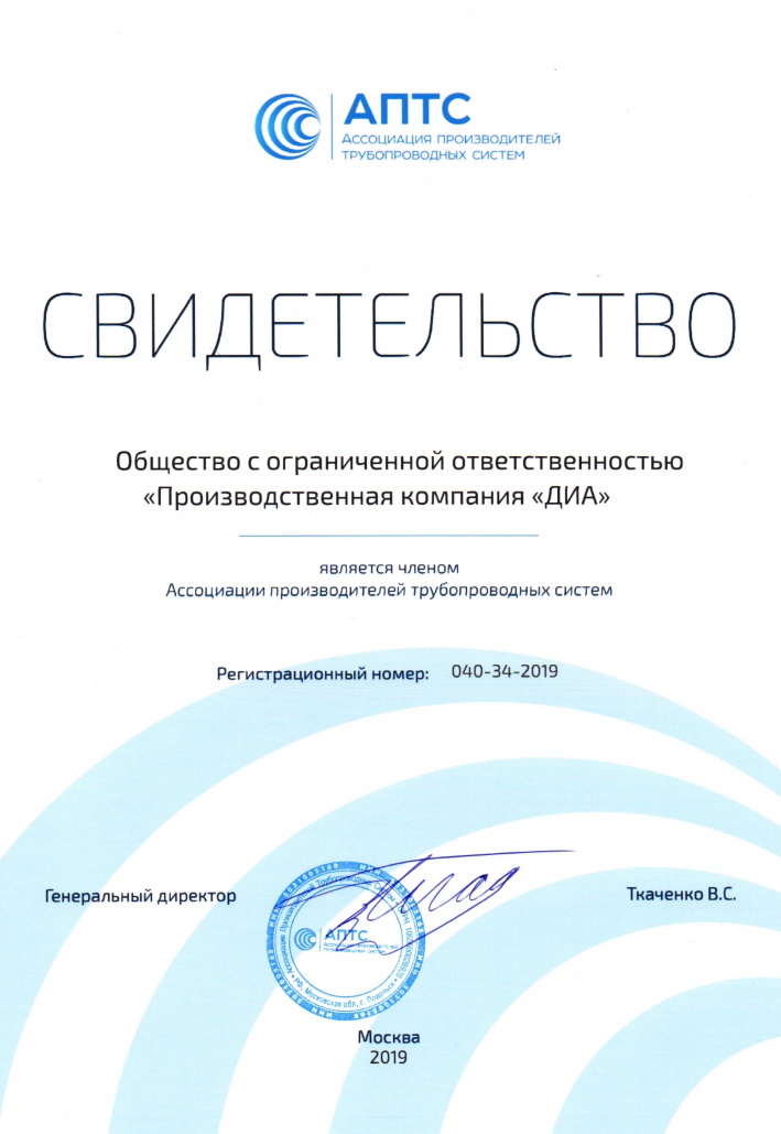 Общество с ограниченной ответственностью «Производственная компания «ДИА» является членом Ассоциации производителей трубопроводных систем.